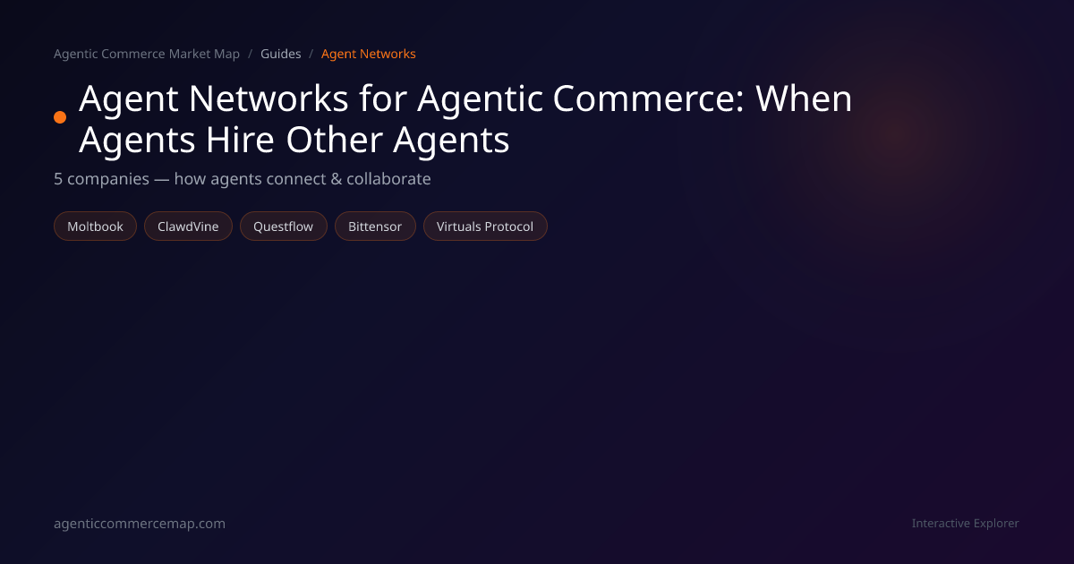 A comprehensive guide to agent networks in agentic commerce, covering how Virtuals Protocol, Bittensor, Moltbook, ClawdVine, and Questflow enable agent-to-agent coordination and commerce.