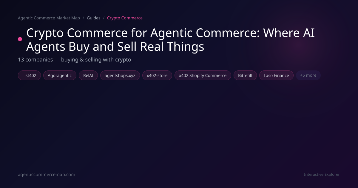 The crypto commerce category includes 13 companies spanning four sub-sectors, each addressing a different piece of the agent shopping experience.